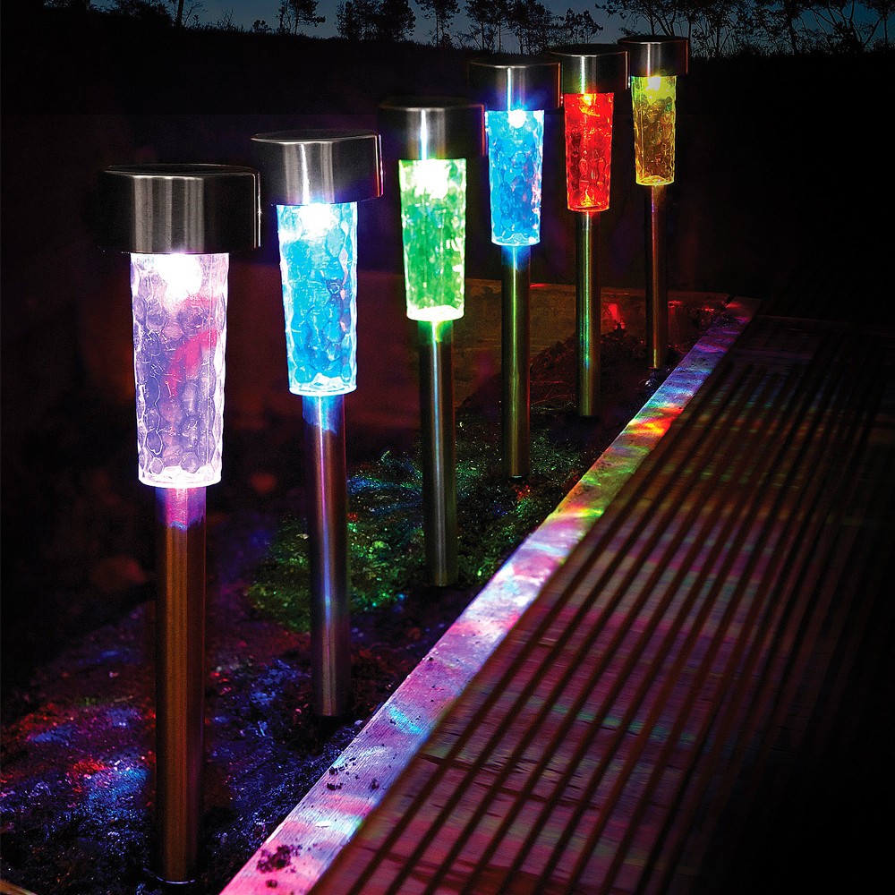 Each shines through a rotation of 4 changing colours: emerald green, sapphire blue, amethyst purple and ruby red. Made with light-enhancing reflective plastic and long-life LEDs, they’re cordless, simply stake them into the ground wherever you like, so no trailing wires or tricky installation. Powered by a self-contained solar panel with rechargeable battery (included) to shine bright for up to 8 hours. Charging by sunlight during the day they switch on automatically after dark to illuminate patios and lawns, borders and pathways, drives and entrances with a rainbow of beautiful light. With a weather-resistant stainless steel finish, each measures 37cm tall including soil spike.