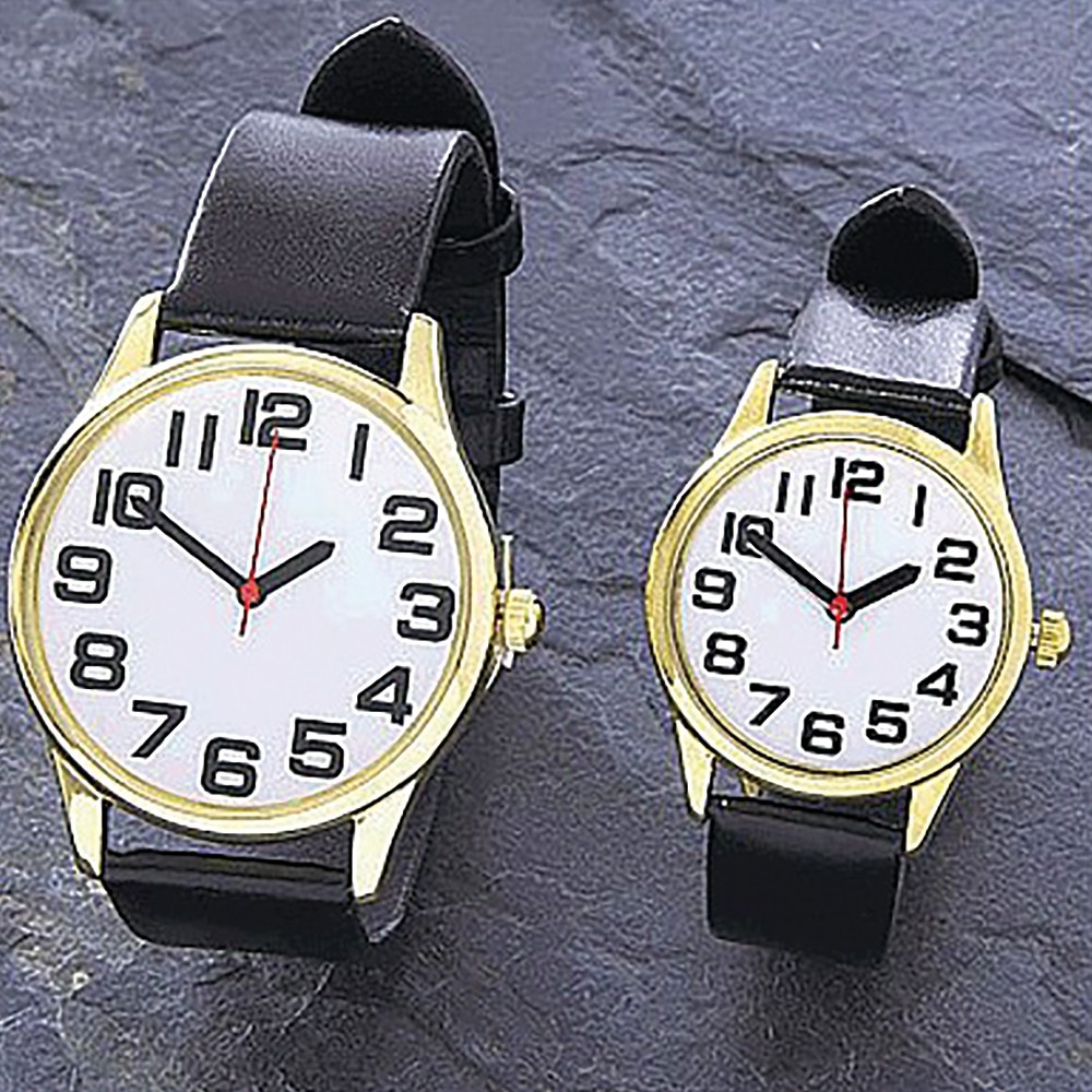 The Big Time Classic Watch represents real value for money and is the perfect watch for those who just want a very clear and easy to read watch face. Ideal for those users with a visual impairment this classic watch, with a quality Seiko quartz movement, has a large analogue face that has large black numbers against a pure white background and big contrasting hands to give a very clear time display. The Big Time Classic Watch has a gold finish metal case with a quality black leather strap and is also available in a smaller ladies version.